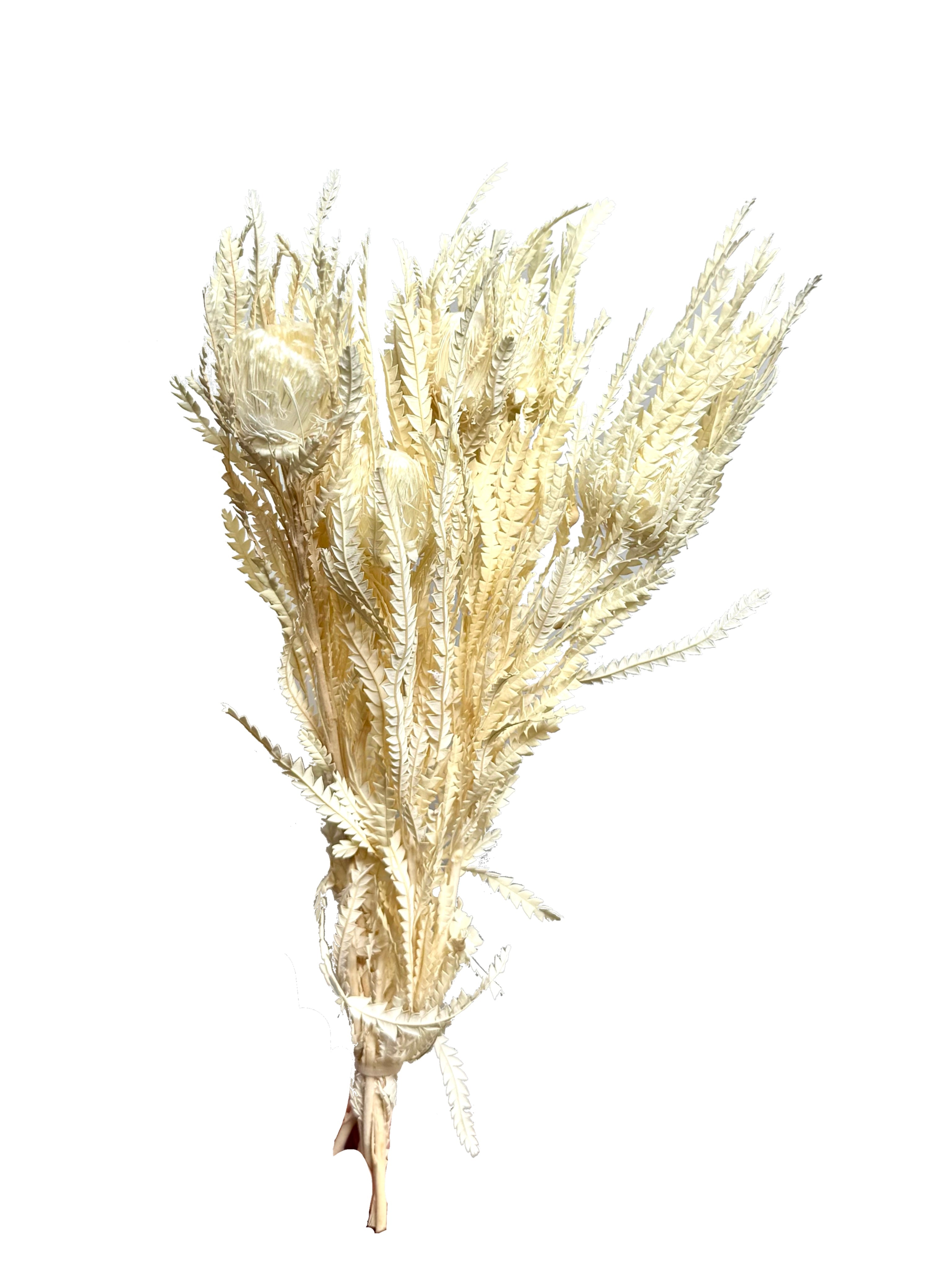 Elevate your floral designs with the timeless elegance of our White Bleached Dryandra Formosa. Sourced from native wildflower species and expertly preserved, these stunning blooms have been carefully bleached to a soft ivory-white tone, creating a clean, sculptural look that blends beautifully into modern and rustic arrangements alike.